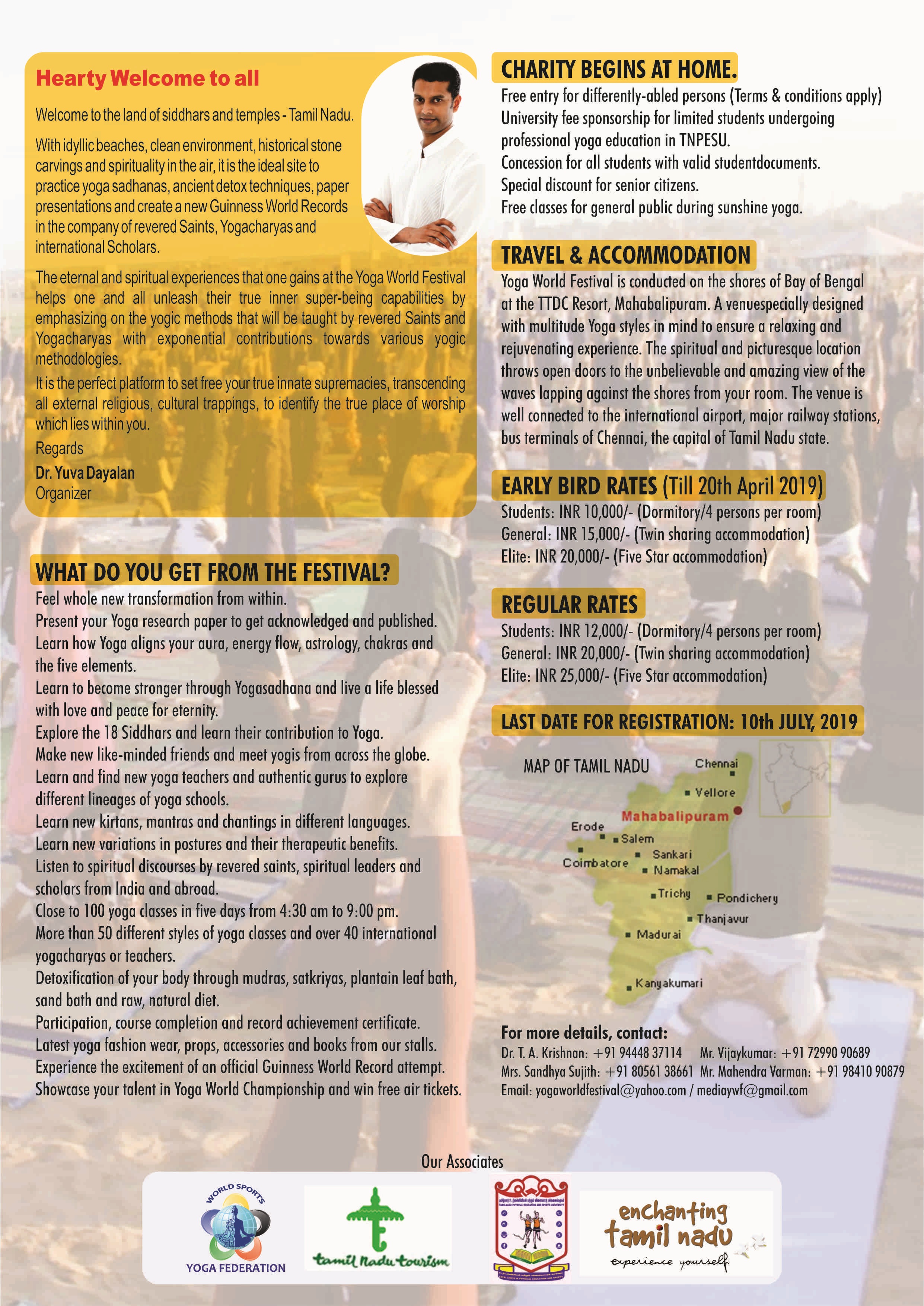 Yuvaa yoga manthiram trust is a philanthropic organization, working towards building a stronger yoga community thereby spreading peace and happiness across the globe. Yuvaa yoga manthiram trust helps to build a platform for all the yoga practitioners across the globe to gain and share their knowledge with experience. It also conducts yoga world festival to enable yoga community to gain insights into various types of yoga. It also pays university tuition fee for deserving yoga students to create many yoga teachers.